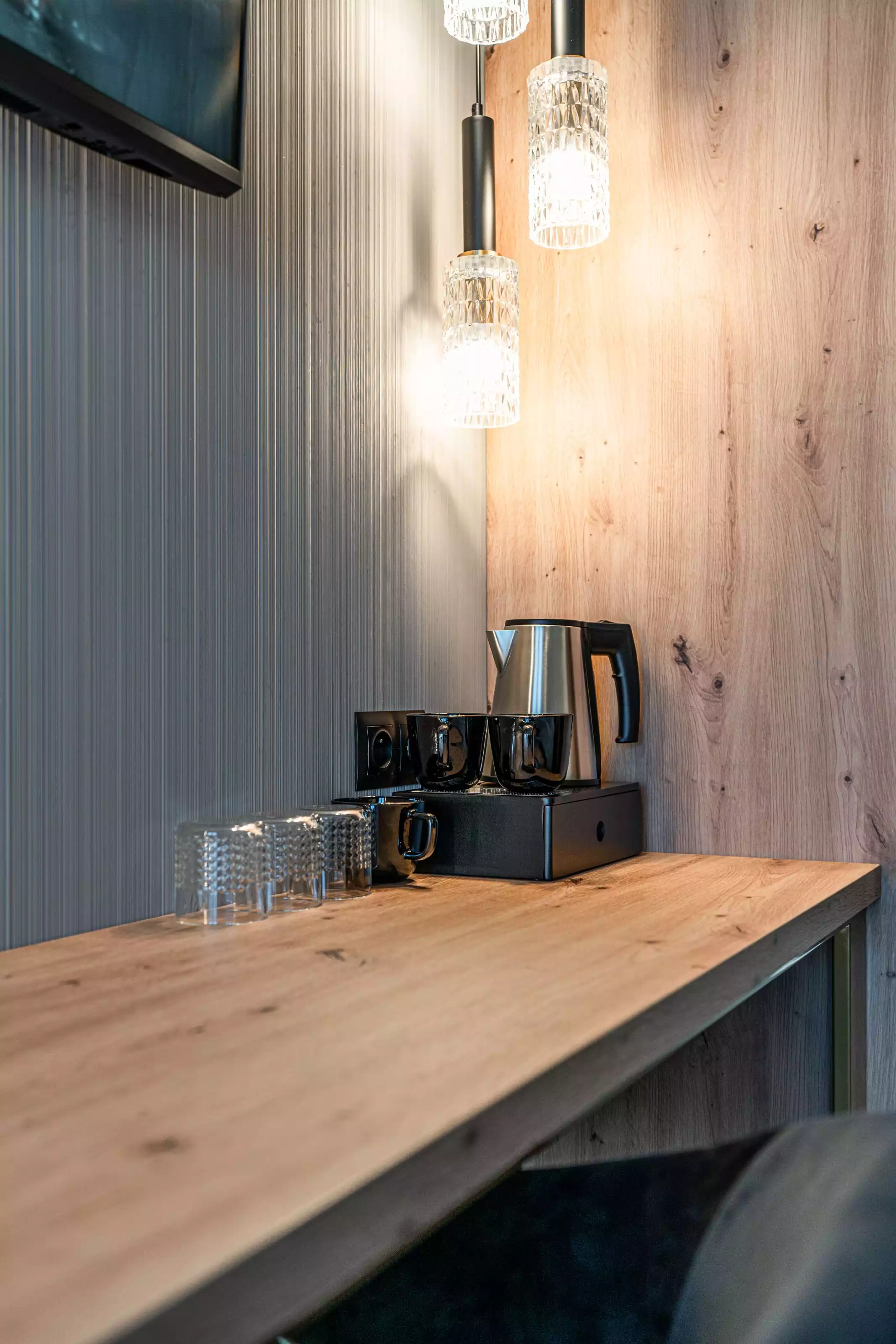 W pokoju znajduje się biurko z krzesłami, lustro, czajnik elektryczny oraz zestaw do przygotowania kawy i herbaty, kawa, herbata oraz woda niegazowana.